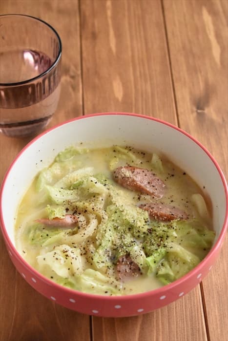 スープまで飲み干したい!キャベツとウインナーの豆乳うどん